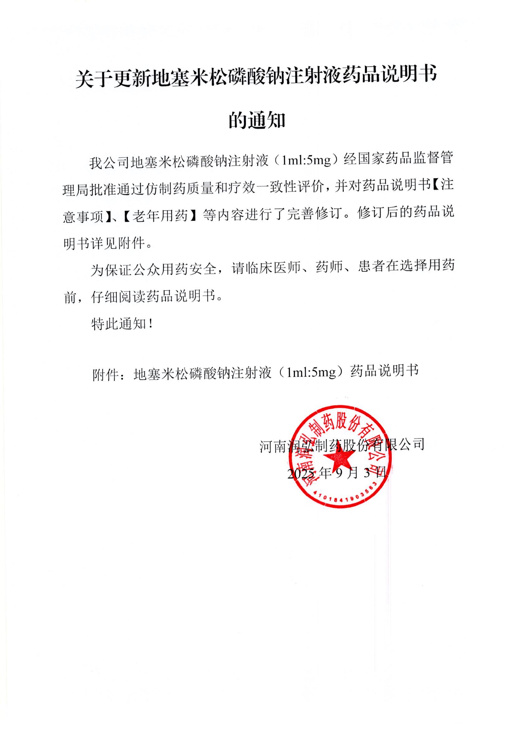 关于更新地塞米松磷酸钠注射液药品说明书的通知