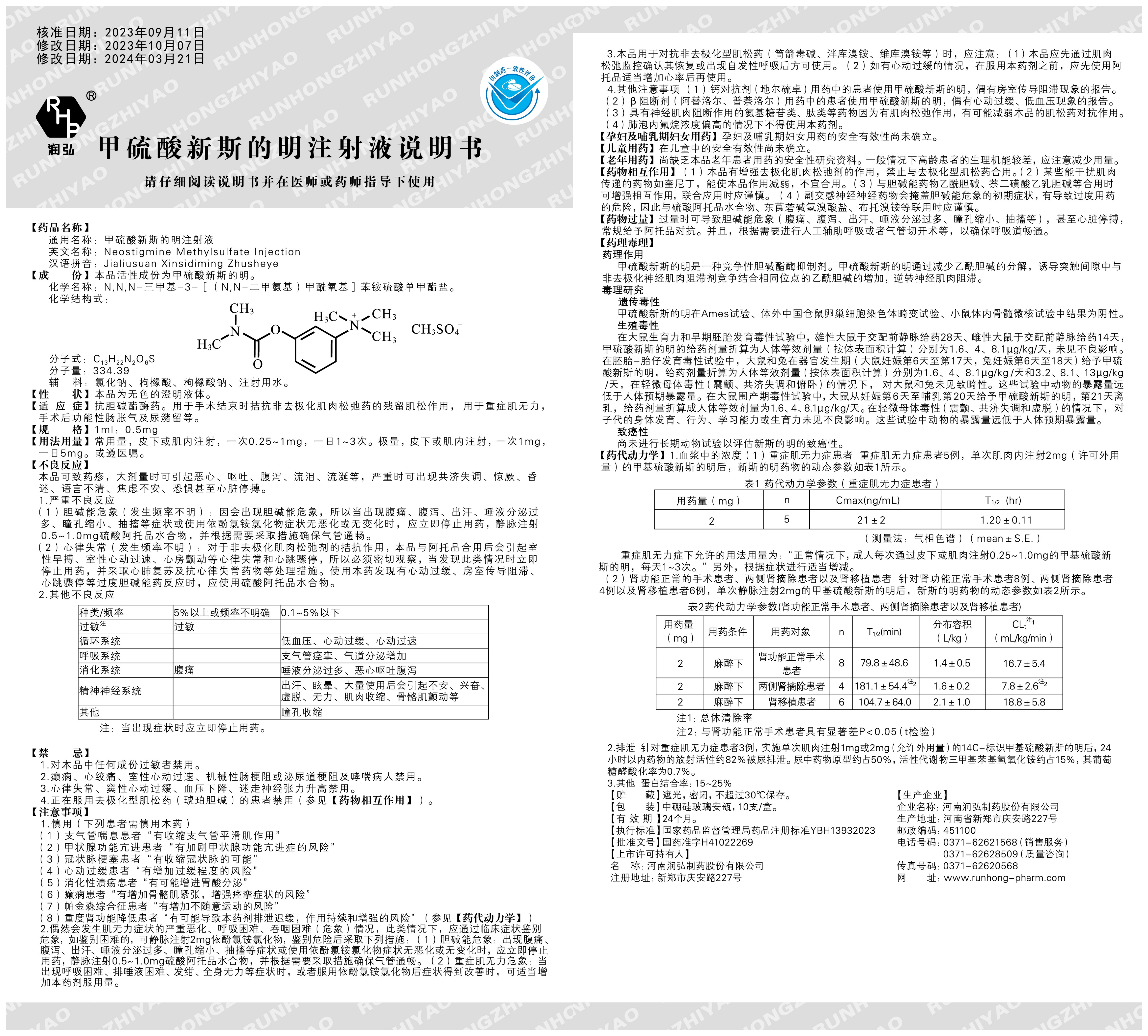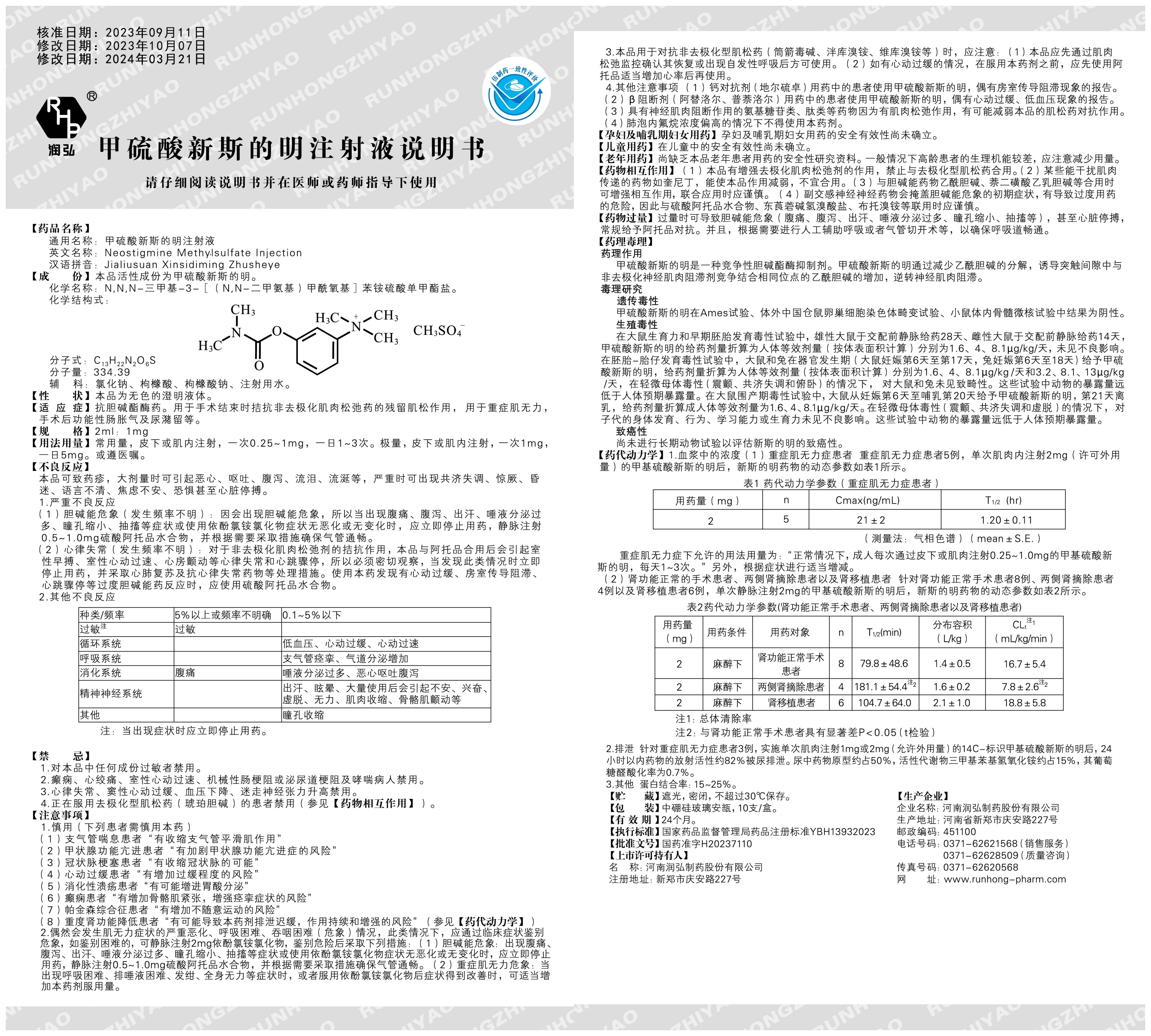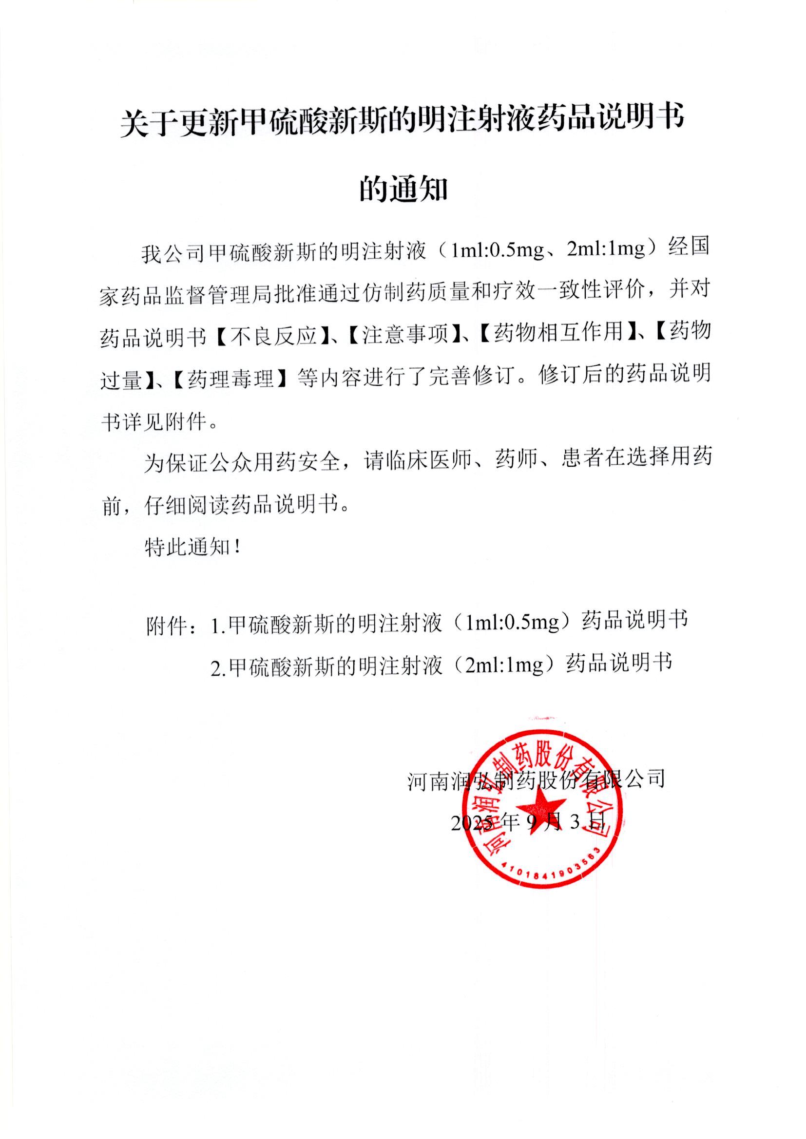 关于更新甲硫酸新斯的明注射液药品说明书的通知